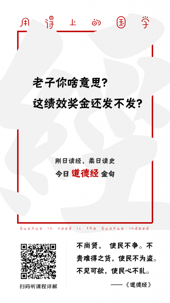 【第三章白話直譯】:不標(biāo)榜賢才異能,使民眾不爭(zhēng)功名;不珍貴難得的財(cái)貨,使民眾不起竊盜;不顯耀可貪的事物,使民眾不被惑亂。所以有道的人治理政事,要使人心靈開闊,生活安飽,意志柔韌,體魄強(qiáng)健。常使民眾沒有(偽詐的)心智、沒有(爭(zhēng)盜的)欲念。使一些自作聰明的人不敢妄為。依照無為的原則去處理世務(wù),就沒有不上軌道的。